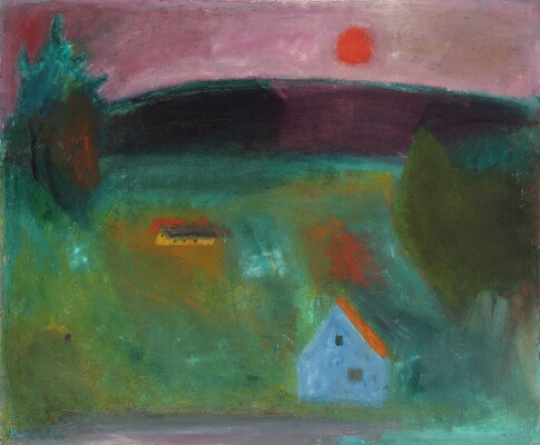 Green landscape with houses and a red sun