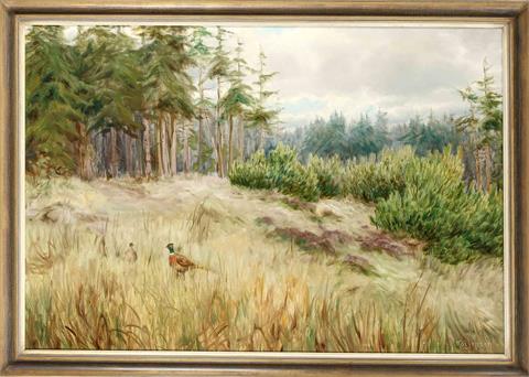 Fasanenpaar in Landschaft mit blühender Heide