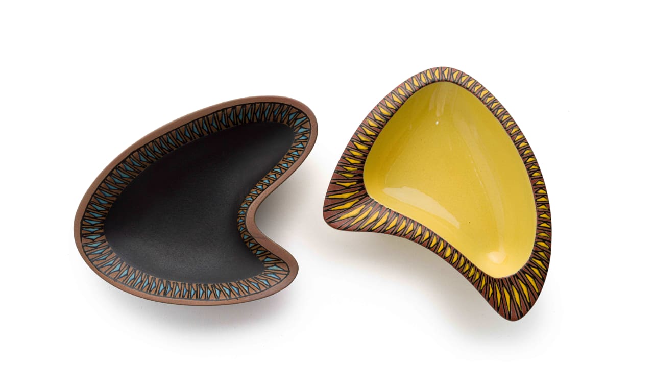 | Pair of three-footed organic-shaped bowls with Ndebele inspired decoration, two | |