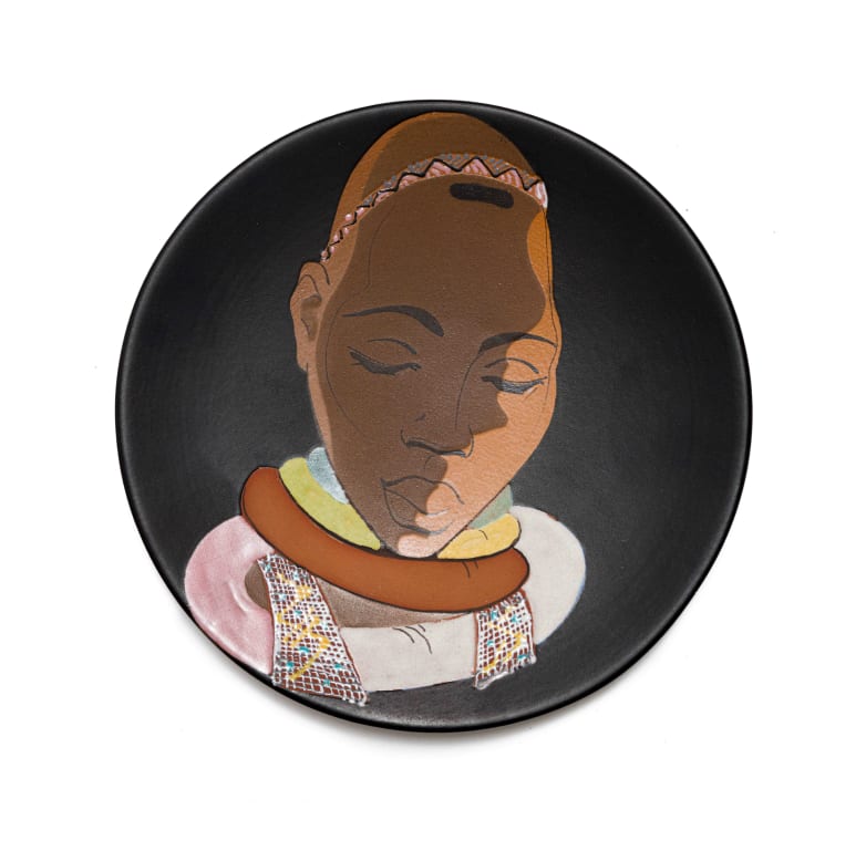 | Plate decorated with a portrait of a woman wearing beaded adornments | |