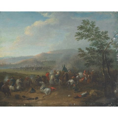 | A CAVALRY SKIRMISH IN AN EXTENSIVE RIVER LANDSCAPE | |