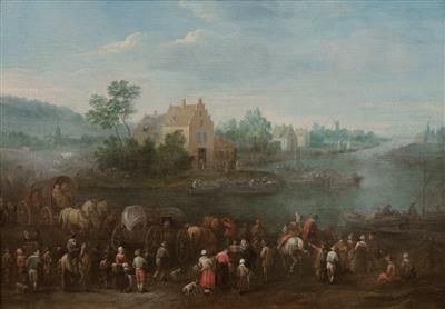 | Eine Flusslandschaft mit Dorfbewohnern und Händlern beim Verladen ihrer Ware | |