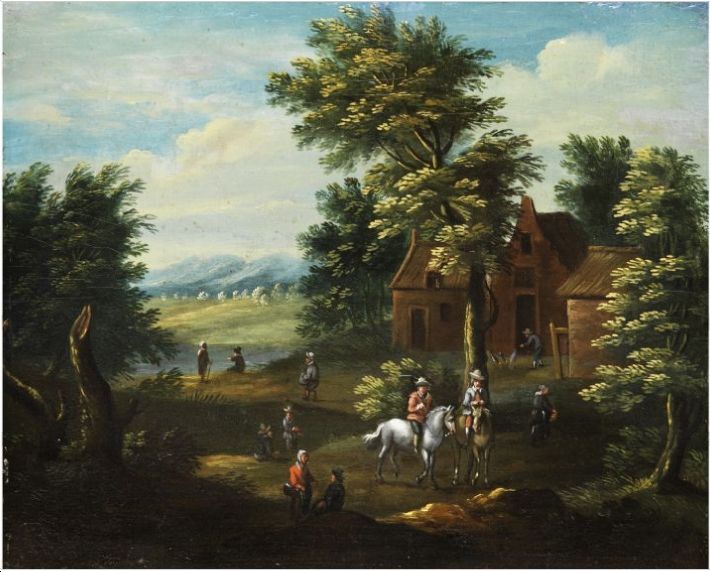 LANDSCHAFT MIT SCHIMMELREITER UND FIGURENSTAFFAGE