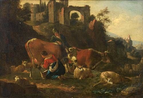 A herdsman and a milkmaid with cattle and sheep before ruins
