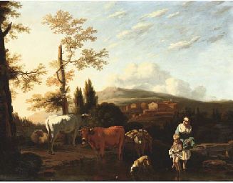 | A peasant woman and boy with cattle in an Italianate landscape | |