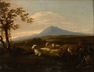 | Ruhende Schafe und Ziegen in einer italienischen Landschaft | |