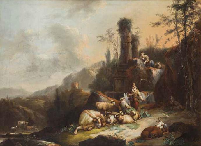 | Hirte mit Esel, Kühen und Ziegen – im Hintergrund ein skulptural geschmücktes Grabmal | |