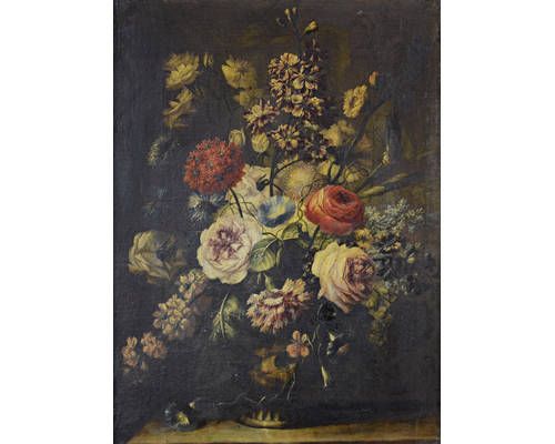 | Roses, jasmine, convolvulus and other flowers in a stone urn on a table top; and A lily, carnations, roses and other flowers in | |