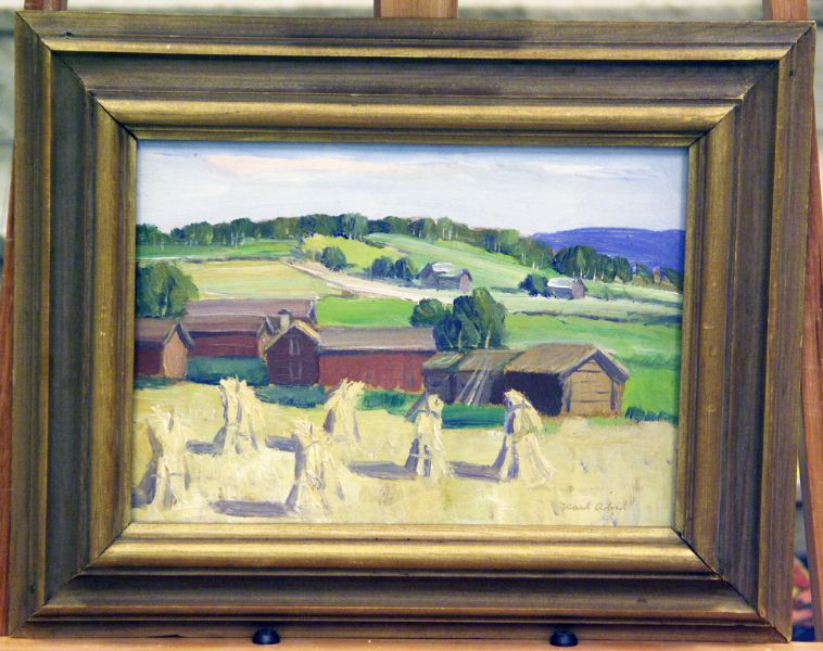Landskap med lador och höbalar