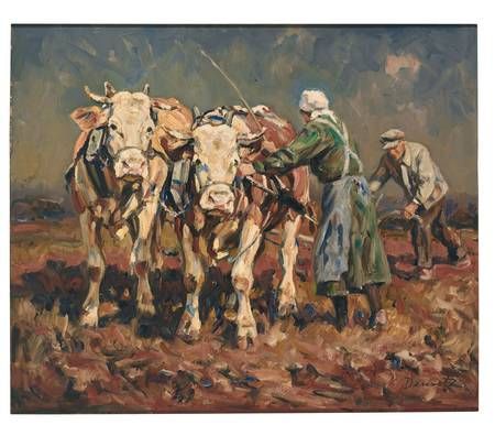 Beim Pflügen. Bauernpaar mit Ochsengespann.