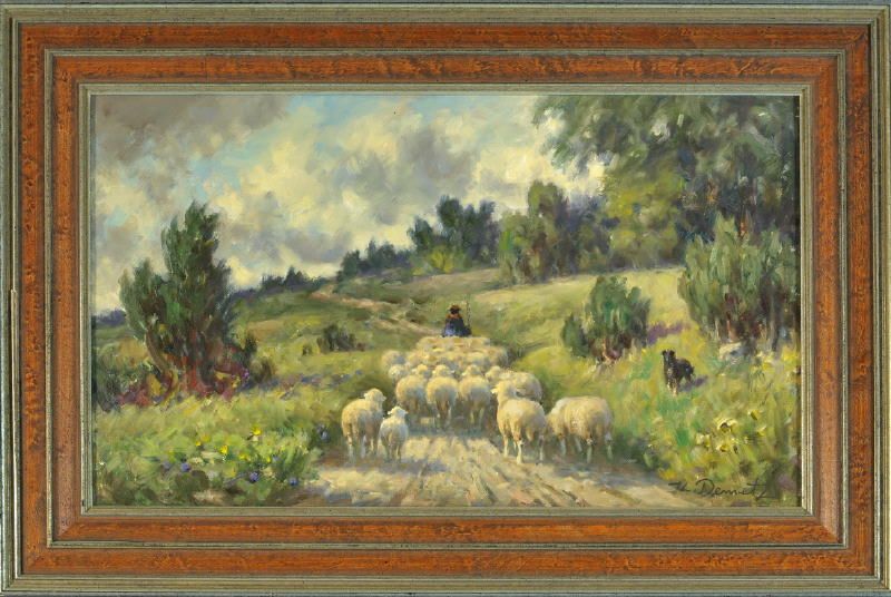Hirte mit Schafherde auf dem Weg durch die Heidelandschaft