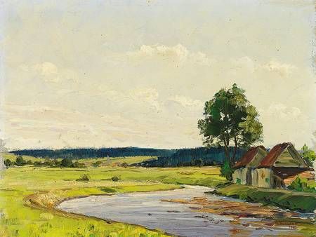 Sommerliche Landschaft mit Flusslauf und Gehöft