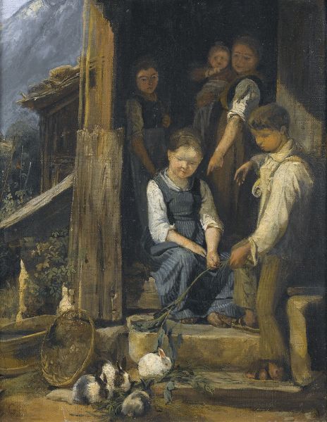 Enfants donnant à manger à des lapins