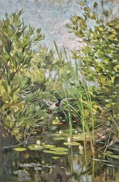 | „TEICHLANDSCHAFT (JOHANNISTAL) MIT AUFFLIEGENDER STOCKENTE“ | |