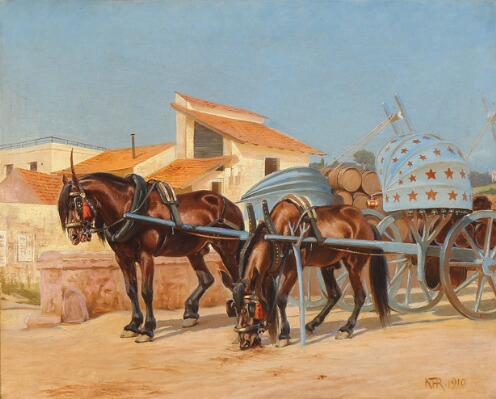 | A southern European street with horse-drawn carriages | |
