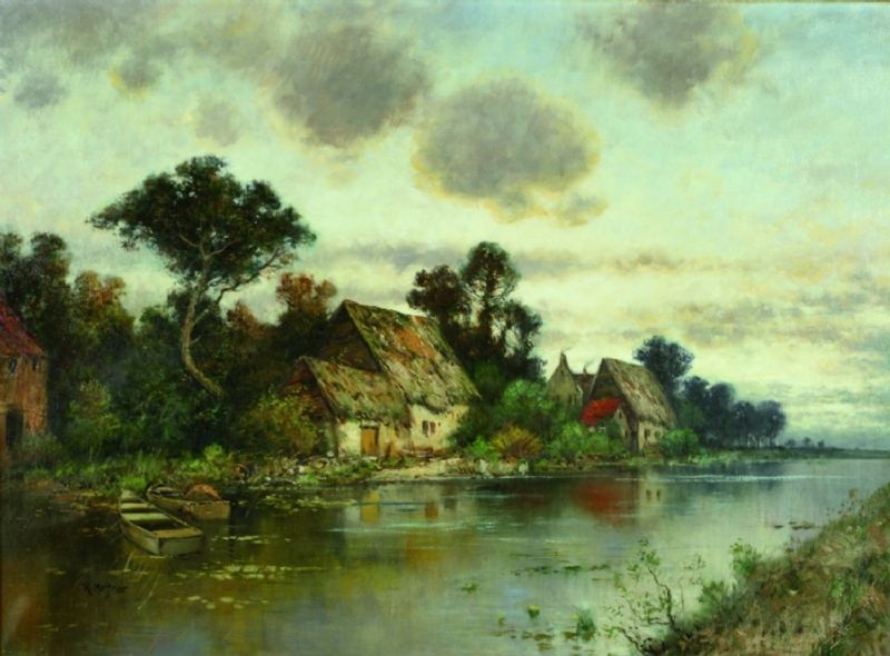 FLUSSLANDSCHAFT MIT REETGEDECKTEN HÄUSERN.