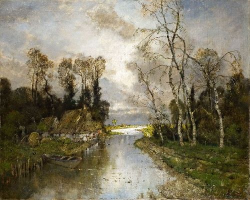 FLUSSLANDSCHAFT MIT STROHGEDECKTEN FISCHERKATEN