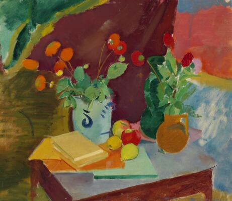 | Nature morte with flowers in grey vase, green and brown vase, fruits and books | |