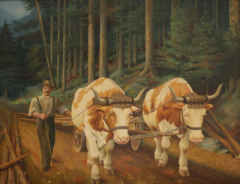 Bauer mit Ochsengespann der seine Baumstämme durch den Wald abtransportiert