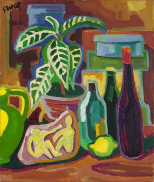 | STILLEBEN MIT FLASCHEN UND BLATTPFLANZE | |