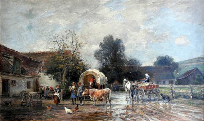 Bauern mit Fuhrwerken auf der regennassen Dorfstraße