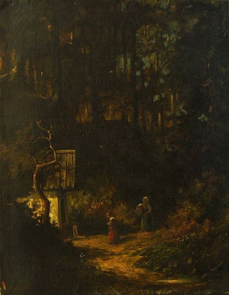 | Mutter mit Kind vor Waldhütte in Abenddämmerung. | |