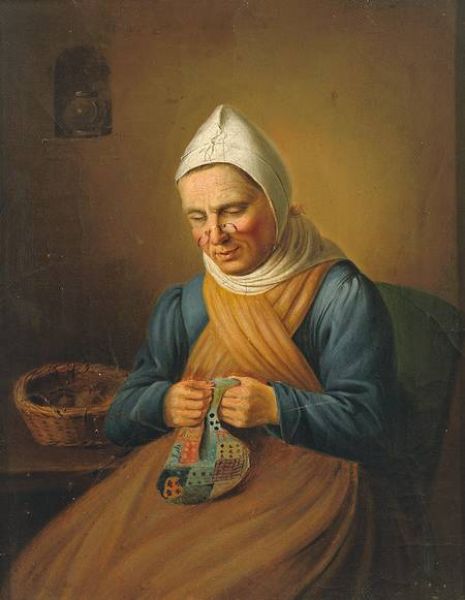 Bäuerin mit Haube, Zwicker und Strickzeug