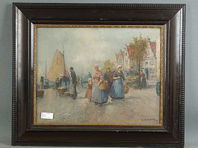 Holländsk hamnbild med figurer