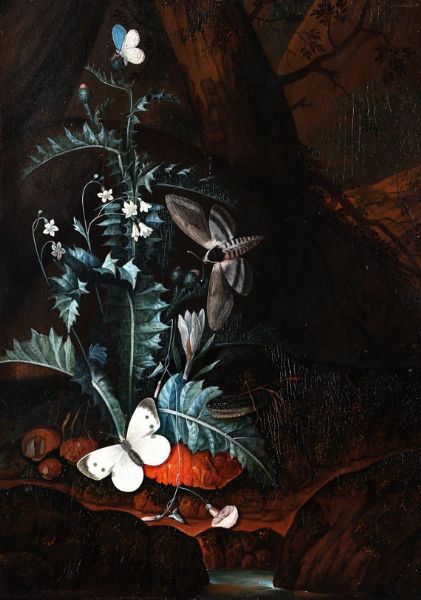 Werkstatt - Waldbodenstillleben mit Distel, Schmetterling und Nachtfalter