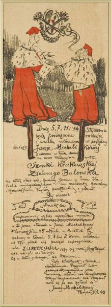 | Dwie magnificencje" - zaproszenie na szopkę "Zielonego Balonika" w Jamie Michalikowej, 1911 r. | |