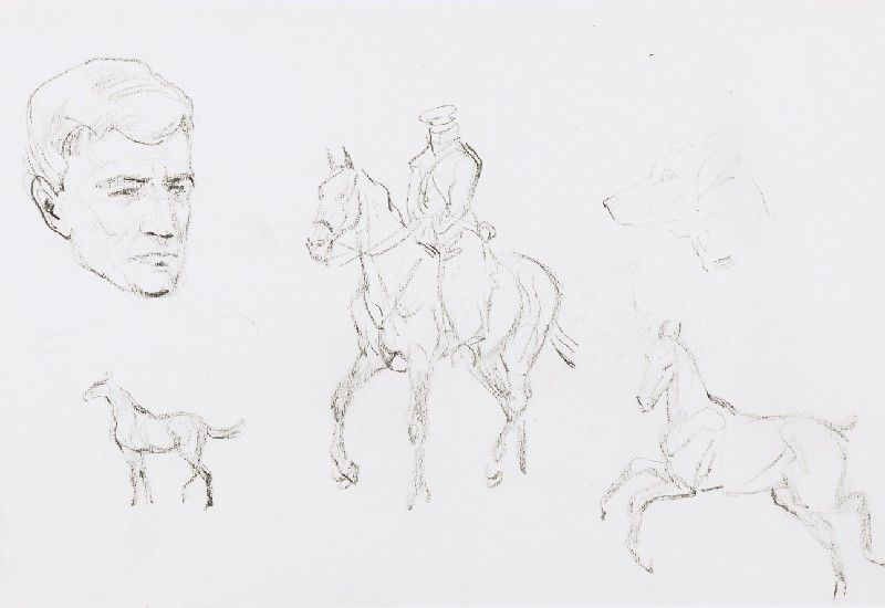 Szkic jeźdźca na koniu, koni, głowy młodego mężczyzny i psa