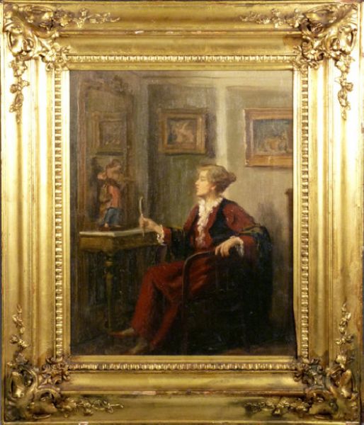 A LADY SEATED AT A TABLE LOOKING INTO A MIRROR,