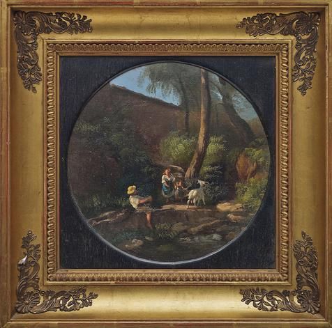Bachlandschaft mit Jüngling, Frau mit Kind und Ziege