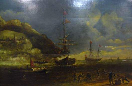 | Pêcheurs de crevettes devant des navires près d'une côte rocheuse | |