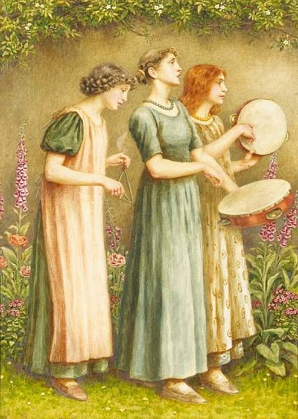 Three women in a garden making music