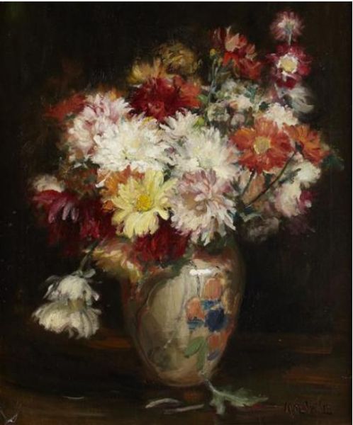CHRYSANTHEMUMS IN A PAINTED VASE
