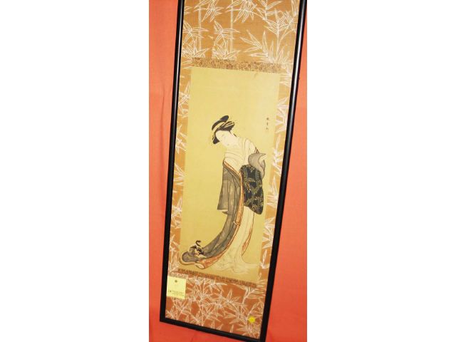 A lady with a kitten pouncing on the train of her kimono