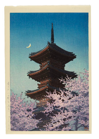 Comprising five oban tate-e prints: the first entitled Haru no yu Ueno Toshogu (Spring Evening at the Toshogu Shrine in Ueno), dated 1948; Shato no yuki, Hinoedajinja (Snow at Hinoeda Shrine), dated 1931; Ikegami honmonji (Honmon Temple, Ikegami in S