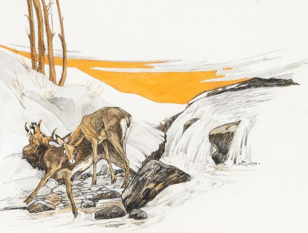 | Snow Leopard and Bear fighting over a Mountain Goat, Kay Nixon (1895-1988) Snow Leopard and Bear fighting over a Mountain Goa | |