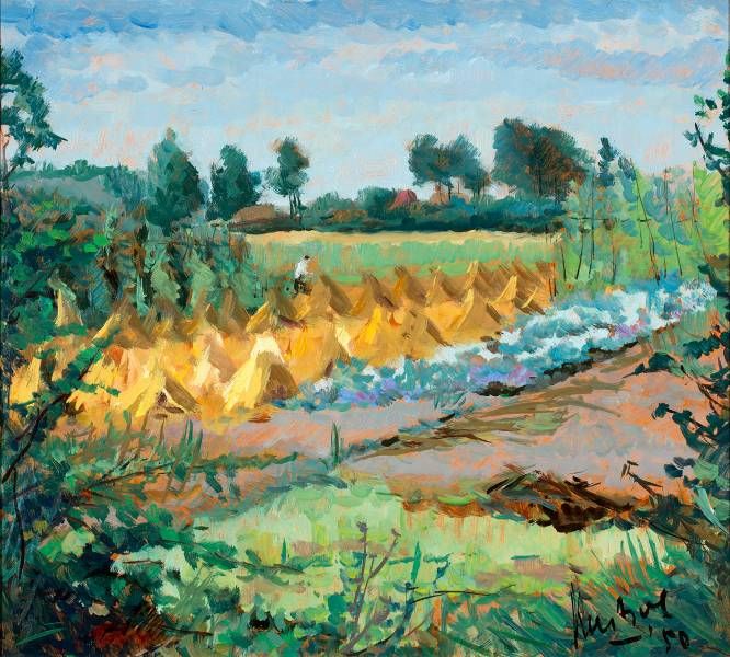 Veld met korenschoven en rodekoolmoestuin in Tongelre, stadsdeel van Eindhoven
