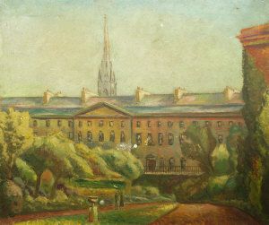 View of a terrace with an ornamental gardens and a church spire beyond