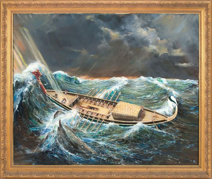A whaling scene with ancient ship in heavy seas