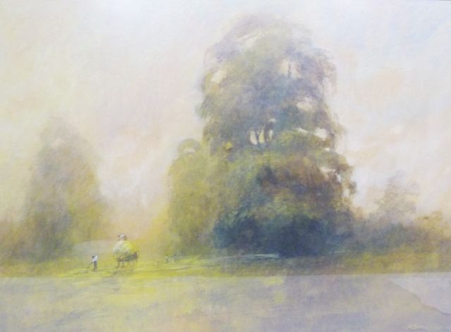 Beneath the Giants, hay gathering before mature trees in misty light,