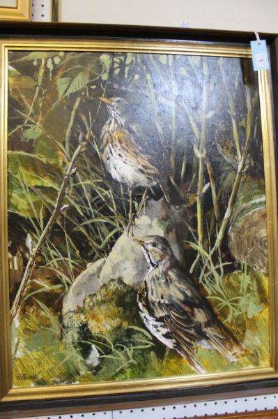 Three song thrush amongst a hedgerow