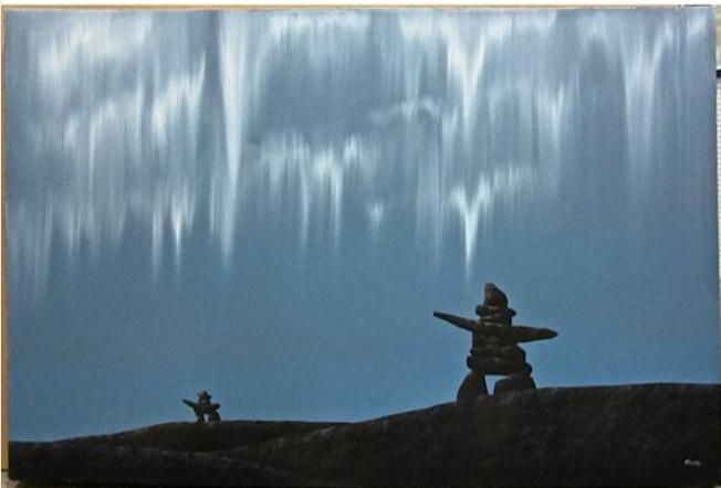 LANDSCAPE WITH INUKSHUKS AND DANCING LIGHTS