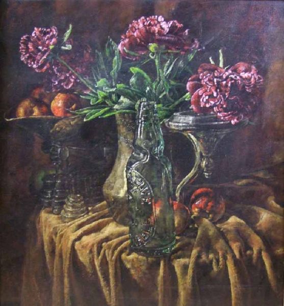 Still Life of Fruit in the Bowl of a Set of Scales, Flowers in a Tankard and a Glass Bottle