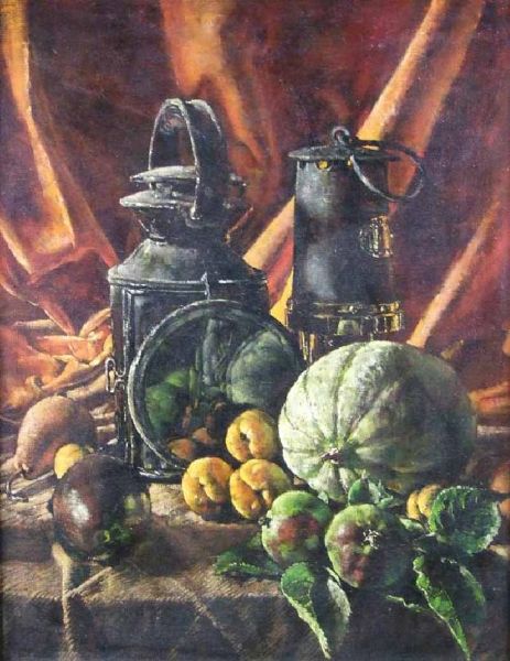 Still Life of Fruit with Miner's Lamp and Railway Lamp