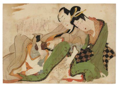 | Estampe érotique Une femme en kimono vert semble jouer avec le pénis turgescent «habillé» d'un kimono marron et d'un chapeau noi | |