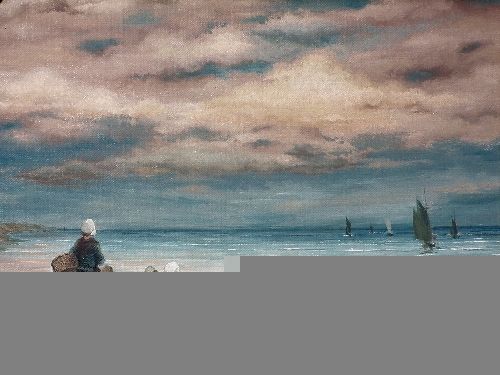 Fisherfolk on beach looking out to sea