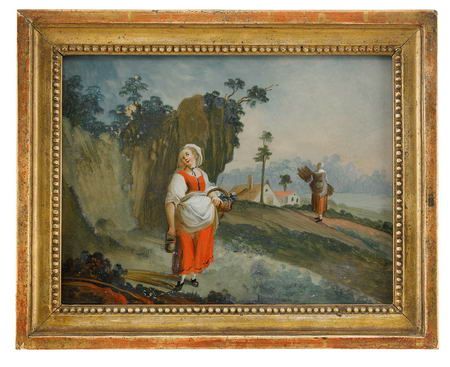 motiv föreställande landskap med kvinnor i traditionell dräkt